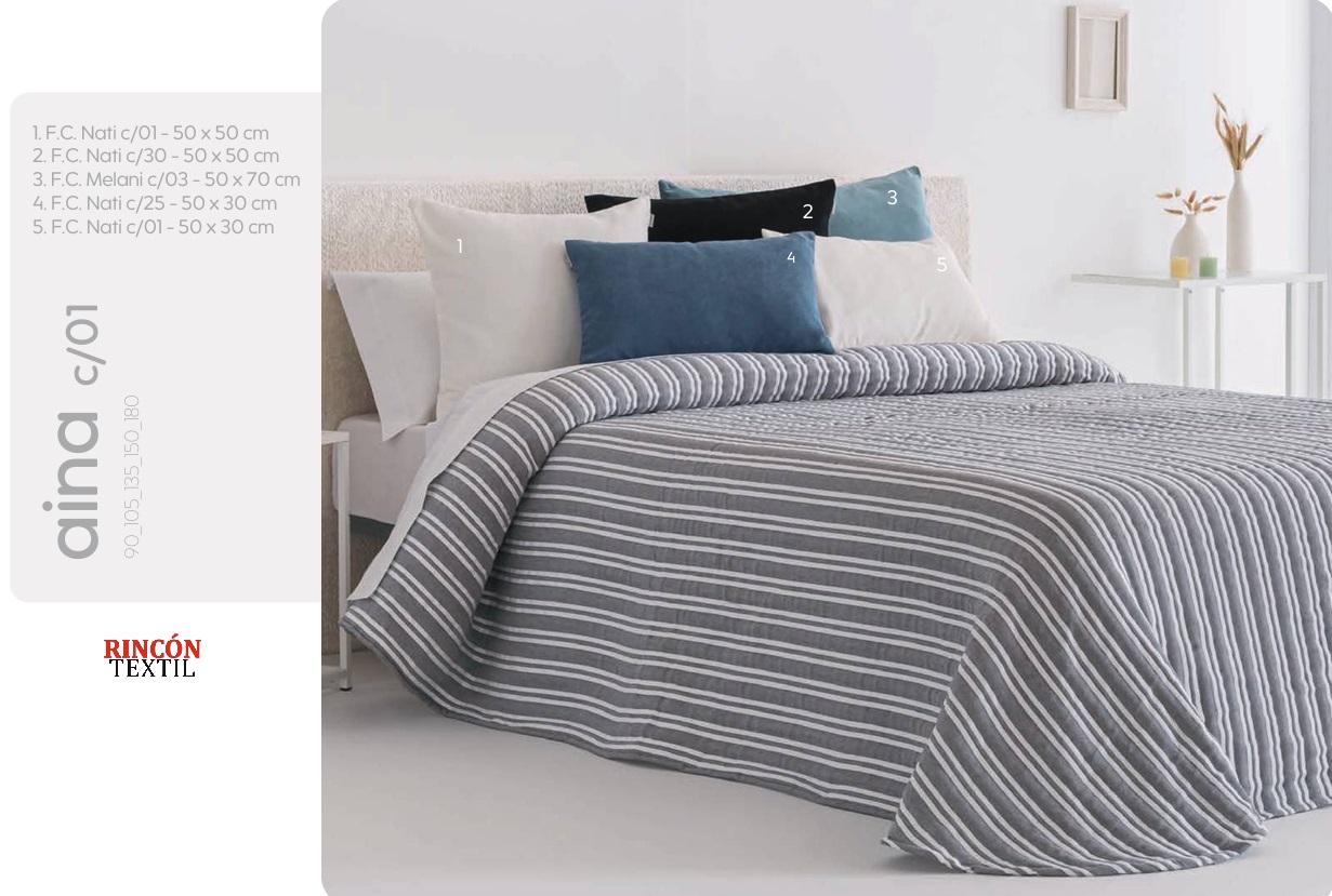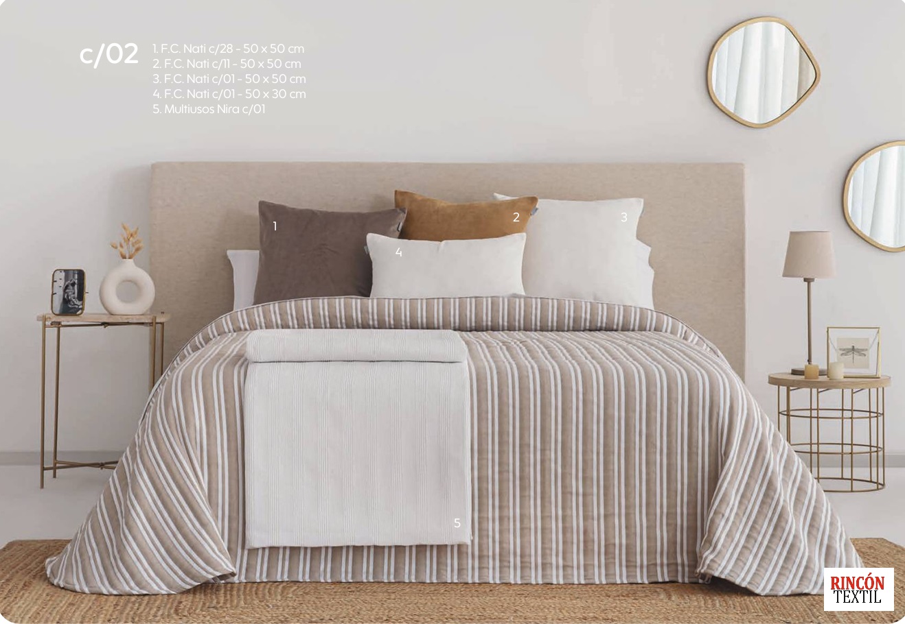 Colcha Bouti Sandeco AINA con tejido jacquard. Esta prenda para vestir la cama es perfecta para los meses en los que empieza a hacer más calor. La colcha de verano hace que tu cama sea la protagonista de la habitación, es decorativa y la puedes utilizar para taparte las noches que hace un poco más de frío. Al ser de tonos más neutros es perfecta para las habitaciones donde quieres aportar más decoración, o por si quieres una decoración más sencilla es perfecta para ti.
